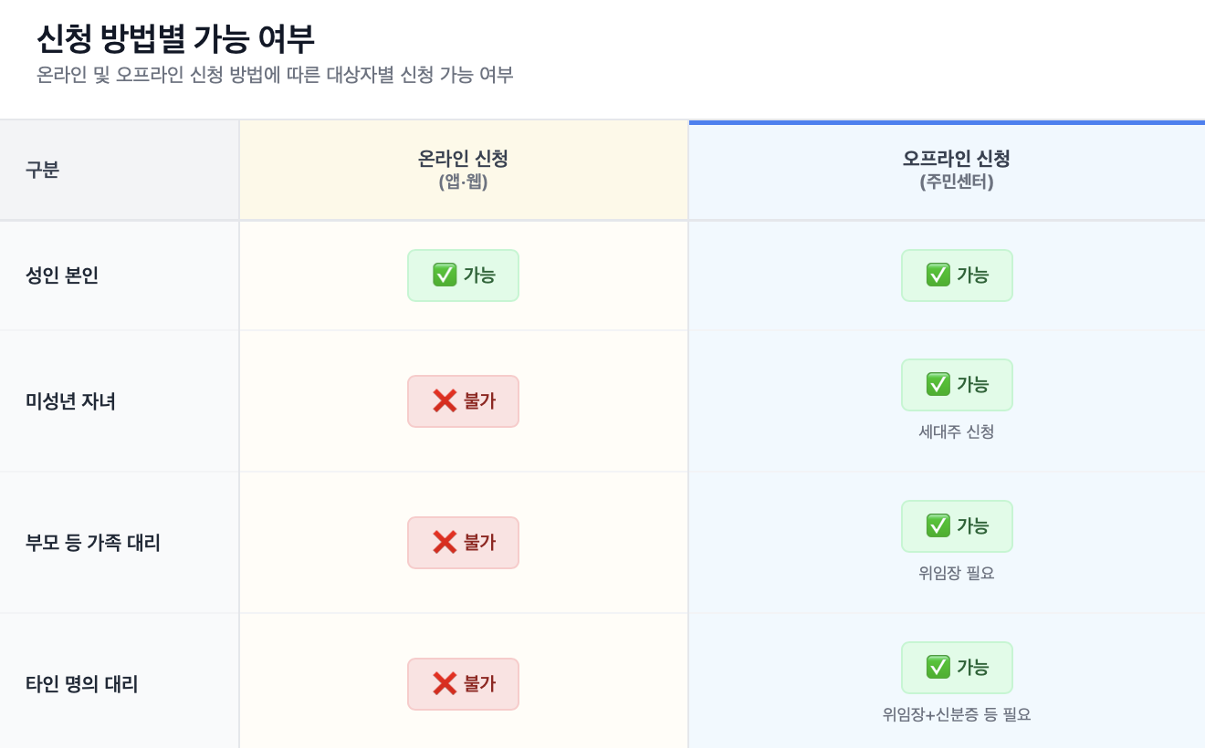 하지만 여러 상황에 따라 본인이 직접 신청하기 어려운 경우가 있어 ‘대리 신청’이 가능한 예외 조항도 함께 마련되어 있습니다. 가장 중요한 구분은 온라인 신청이냐, 오프라인 신청이 가능한가입니다.